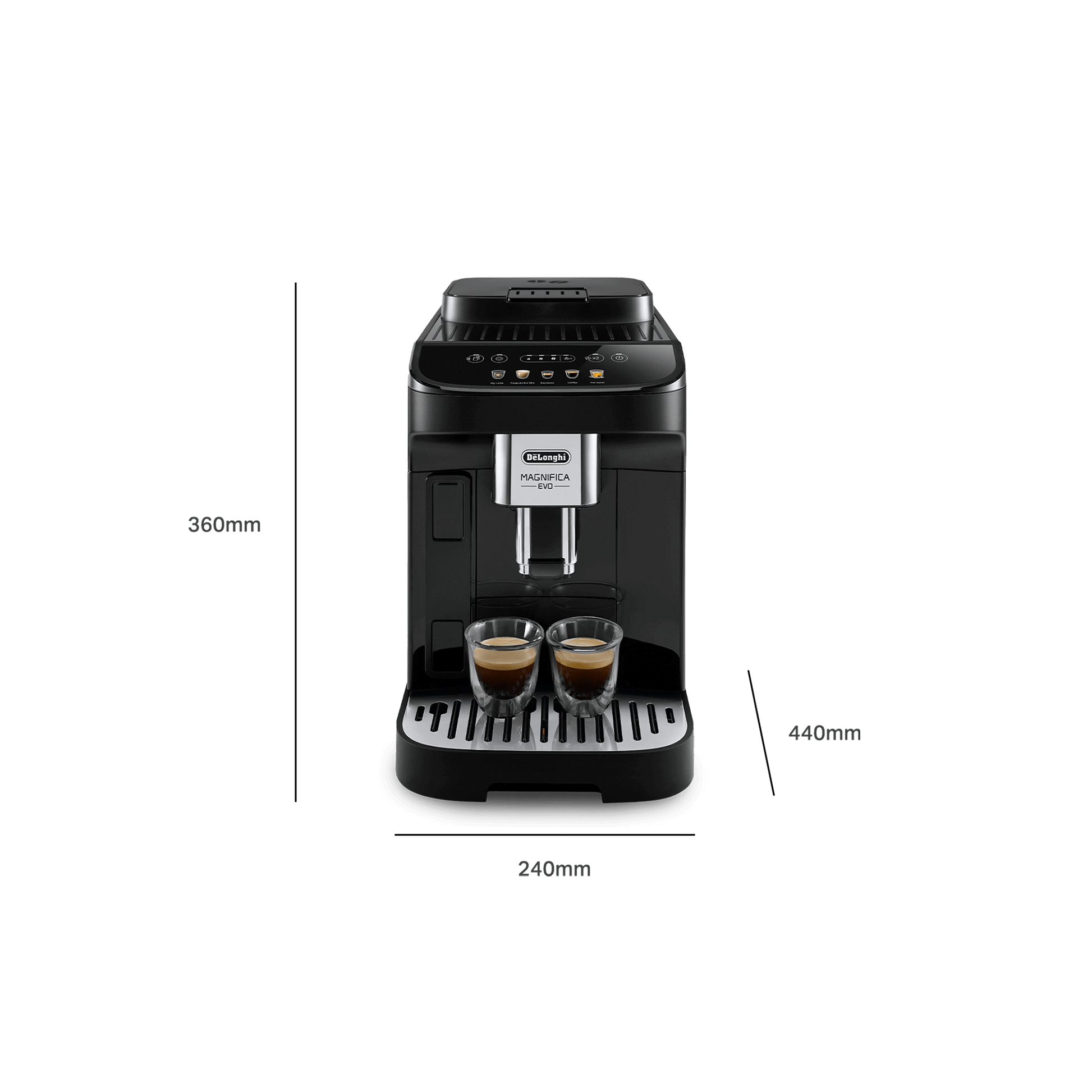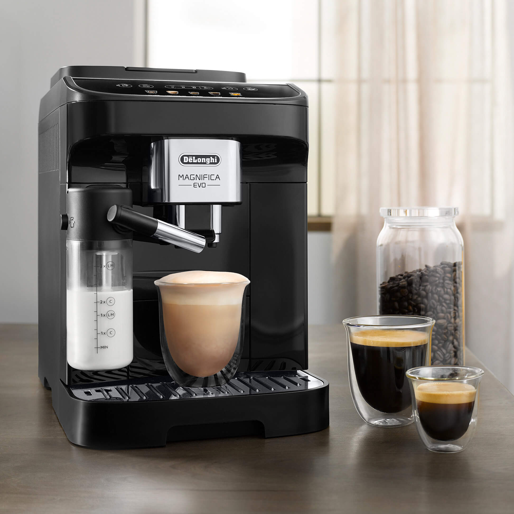 Magnifica Evo brings the De’Longhi experience into your kitchen with advanced technology and a sleek, modern design. From the perfect espresso to a variety of milk-based drinks, every cup is crafted with ease. With 7 one-touch recipes available through a simple interface, great coffee is always just a touch away.